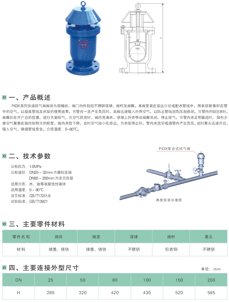 KP快速排氣閥一般壓力PN10-40/1.0-6.4MPa,150Lb-300Lb/2.0-5.0MPa,口徑為DN25-350mm,適用介質(zhì)為清水,適用于城建,自來(lái)水廠,供暖系統(tǒng),水利,等管路上,一般都是采用法蘭連接方式,適用于工業(yè)介質(zhì)為水的管路上,作為瑞奇排氣閥排除管道內(nèi)氣體的設(shè)備,以提高輸送水設(shè)備的效率和保護(hù)管道不致變形破裂,是管道的必備之設(shè)備。閥為圓桶狀式閥體,共內(nèi)部主要有不銹鋼浮球及塞頭。 本閥裝設(shè)于泵埔出口處或送配水管線中,用以大量排除管道中的集結(jié)之空氣,以增進(jìn)水管及抽水機(jī)使用效率,且與管內(nèi)一旦出現(xiàn)負(fù)壓時(shí),此閥能迅速吸入空氣,以保管線因負(fù)壓所產(chǎn)生損壞。 KP排氣閥工作原理: KP快速排氣閥利用了水對(duì)浮球的慣性自動(dòng)開啟/關(guān)閉排氣口。說(shuō)得具體一些就是:利用水對(duì)不銹鋼浮球的浮力的向上作用特性原理,當(dāng)水位在閥內(nèi)上升,在排氣的同時(shí),浮球受到水的浮力作用,不銹鋼球自動(dòng)上浮,直到浮止與排氣口的密封面接,水泵給壓到一定壓力時(shí)球會(huì)自動(dòng)關(guān)閉,當(dāng)閥內(nèi)水位降低時(shí),不銹鋼球會(huì)隨水位下降而下降,這時(shí)就會(huì)通過(guò)排氣口向管道注入大量空氣,裝在管道上后,當(dāng)管道在運(yùn)轉(zhuǎn)時(shí),浮球停在球碗底部,進(jìn)行大量排氣,當(dāng)管內(nèi)空氣排完,水沖進(jìn)閥內(nèi),經(jīng)過(guò)球碗然后反應(yīng)浮球,使浮球浮動(dòng)關(guān)閉,管道在正常運(yùn)轉(zhuǎn)時(shí),如有少量氣體會(huì)集中到閥內(nèi)到相當(dāng)程度,閥內(nèi)水位下降,浮球隨之下降,氣體從小孔排出。如水泵停止,隨時(shí)會(huì)產(chǎn)生負(fù)壓力,浮球隨時(shí)下降,進(jìn)行大量吸氣確保管路安全。 適用范圍 瑞奇KP快速排氣閥應(yīng)用于獨(dú)立采暖系統(tǒng)、集中供熱系統(tǒng)、采暖鍋 爐、中央空調(diào)、地板采暖及太陽(yáng)能采暖,城市給水系統(tǒng)等管道排氣。因?yàn)樗型ǔ6既苡幸欢ǖ目諝猓铱諝獾娜芙舛入S著溫度的升高而減少,這樣水在循環(huán)的過(guò)程中氣體逐漸從水中分離出來(lái),并逐漸聚在一起形成大的氣泡甚至氣柱,因?yàn)橛兴难a(bǔ)充,所以經(jīng)常有氣體產(chǎn)生。為此就延生出排氣閥這一名詞,在日常生活也解決了不少問(wèn)題。