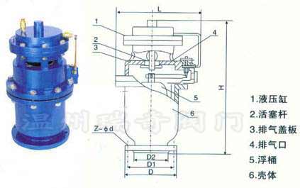 本閥由下閥體,中閥體,浮筒,浮筒桿,閥芯,蓋板,活塞桿,膜片及閥蓋等組成的全壓高速排氣閥,其特征是通過銷軸與浮筒鉸接的浮筒桿可繞主軸轉(zhuǎn)動(dòng),并由此實(shí)現(xiàn)通過浮筒升降控制閥芯的升降啟閉,即當(dāng)浮筒下降(閥體里充滿氣體)時(shí),閥芯上升,打開小閥口,并關(guān)閉小排氣帽上的排氣口,使氣體通過導(dǎo)管進(jìn)入液壓罐內(nèi),當(dāng)浮筒在浮力作用下上升時(shí)候,閥芯下降,關(guān)閉小閥口,同時(shí)打開排氣帽上的排氣口,使液壓罐通過導(dǎo)管,直通大氣泄壓,且當(dāng)浮筒下降,液壓缸內(nèi)充滿氣體時(shí),閥門上的大排氣口自動(dòng)關(guān)閉。當(dāng)水泵停止,管內(nèi)水流空時(shí)或遇到管內(nèi)產(chǎn)生負(fù)壓時(shí),吸入空氣,確保管線安全。